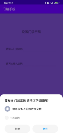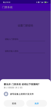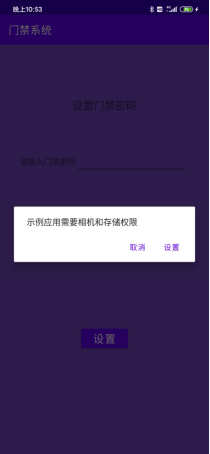 设置门禁密码界面会动态授权,若用户拒绝授权会弹出设置提醒,引导用户手动授权,设置密码需要输入两次一致的密码才能设置成功。